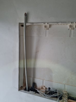 Musste heute wieder viel Zeit in der Firma sein, am Nachmittag dann aber eine Runde rüber. Zum Warmwerden dachte ich mir: mach ich "schnell" die Leitung fürs Dusch-WC. Durchzugsdraht ging bissl streng, aber da ich nur 3 x 1,5 mm2 einziehen musste, dachte ich: bissl Gleitmittel und los gehts. Gefühlt eine Stunde, völlig ruinierte Hände, Striemen an der Schulter und überlastete Unterarme später war das blöde Kabel dann drin. Wahrscheinlich hings ganz am Ende in dem eingemauerten Teil. Das ist jetzt leider die dritte derartige Problemstelle...