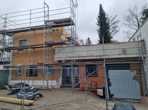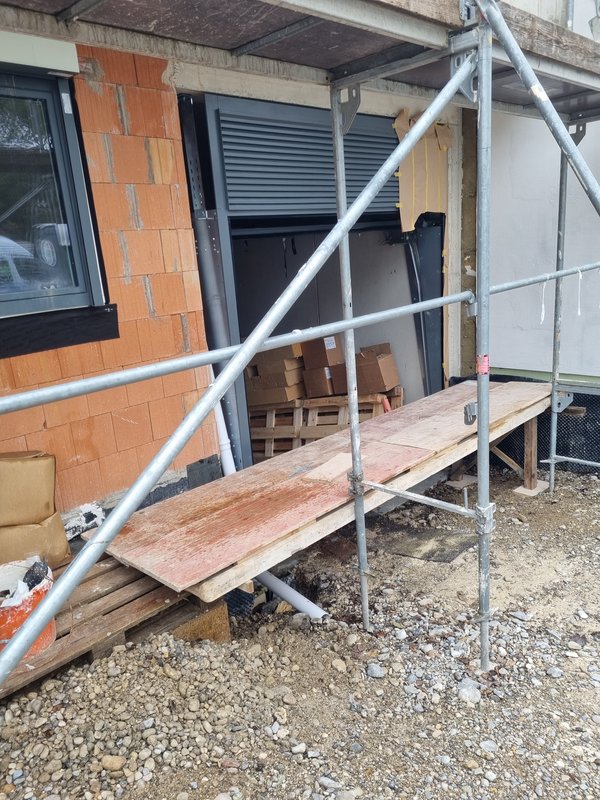 War da und hat "Gerüst" für Dämmer gebaut, dass die vorm Garagentor oben dämmen und verputzen können. Und haben mein "Loch" aus dem Kabelziehen wieder verschlossen.