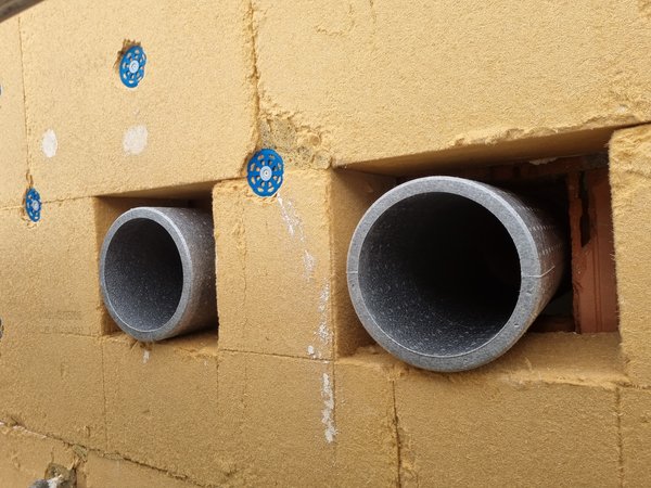Endlich wars mal paar Stunden trocken, so dass ich die Lüftungsrohre nach außen verlängern konnte und die Dämmer es einarbeiten können.