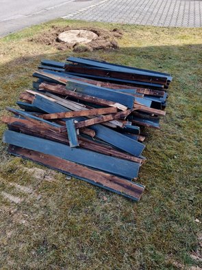 Im Garten das Holz dann auf 2,70 m geschnitten, damit wir es nach AT als Ersatz-Zaunlatten mitnehmen können. Osterausflug mit Bulli :-)