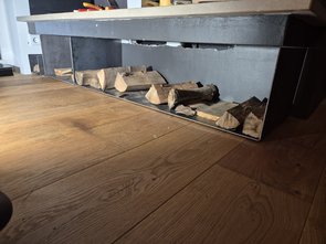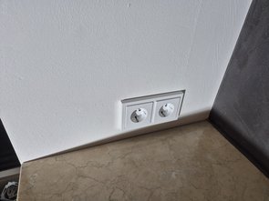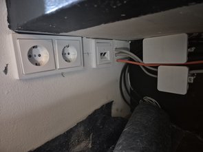 Schwieriger wurds dann unten drunter. Nicht wegen des Platzes, das war nur nachrangig. Sondern weil der Trockenbauer die Platte da einfach unten am Boden eingeklemmt hat und nur vorne gscheit befestigt hat. Somit ist mir beim Lochbohren alles oberhalb ausgebrochen und die Dosen haben kaum Halt :-( Habs zum Glück so hinbasteln können, dass sie dtrotzdem recht gut halten und die fertige Steckdose absolut stabil sitzt. Kabel war bissl Gefummel und Netzwerkdose auch. Aber jetzt isses alles fertig und schaut richtig geil aus. Danach noch die Holzplättchen für den Abstand zum Parkett unter die Holzlegen geschoben und gesaugt. Schon echt geil geworden :-) (Die Luftschlitze unten sieht man natürlich von oben normal nicht).