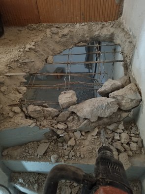 In der Früh mit Maschinenverleih in Hohenbrunn telefoniert, haben leider nur die kleine der großen Hilti-Abbruchhämmer. Aber egal, geholt und zwei Stunden (mehr ging weder terminlich noch von den Unterarmen her) gehämmert. Nachbarn sind derweil zum Einkaufen gefahren.