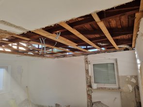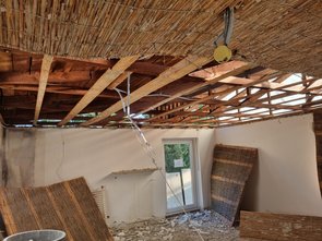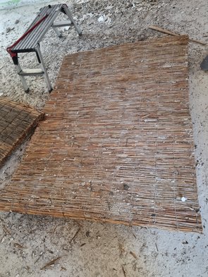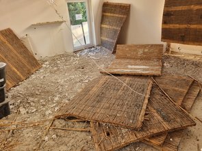 Dann Schilfdecke demontiert. Gscheite Sauerei. Auf dem Schilf lag oben drauf oft Kiesel. Auf ein paar Matten leider auch Bitumenkleckse. Die müss ma entfernen, sonst Sondermüll.