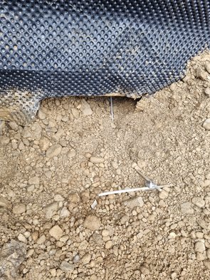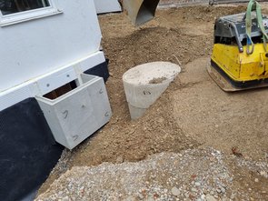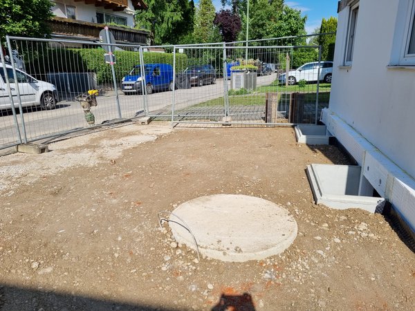 Dann wurde es echt stressig, weil die Lichtschächte gesetzt werden mussten, damit zugebaggert werden kann. Aber mit vereinten Kräften und einer zweiten, etwas weniger steilen Bohrung (und einem Kreuzverbinder) hats dann geklappt :-)