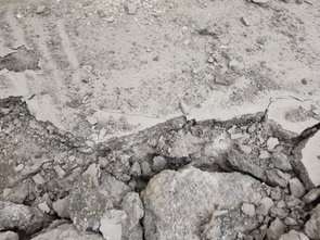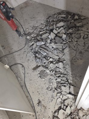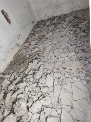 Blöder - um nicht zu sagen: richtig blöd - wurds dann im alten Waschkeller (neuer Technikraum): dort ist der Bodenaufbau zweischichtig: oben drauf ein (dünner) Estrich mit Betonfarbe und drunter ein richtig zäher Beton. Der Estrich hält auch den Beton zusammen, so dass man den Estrich getrennt stemmen musste (sprang ganz gut). Aber der Untergrund war richtig dick.