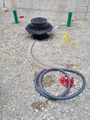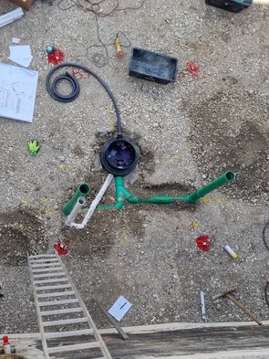 Die grünen Rohre sind Abwasser, das weiße ist Entlüftung. Das graue die Druckleitung (ich dachte, das muss mega kompliziert eine Edelstahlleitung gelegt werden, nein: ganz einfach ein Schlauch mit Klicksystem (dessen Klicksystem ich erstmal mit Sand verunreinigt hab :-( - Reinigung hat länger als Montage gedauert).