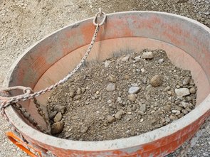 Und dann noch den ausgebuddelten Kies in die Betonbombe zum Abstransport aus der Baugrube geschaufelt. Etwa 300 Liter!