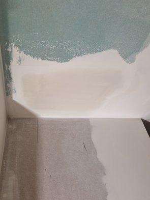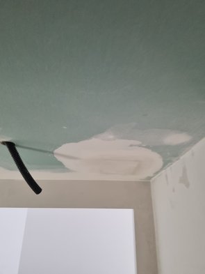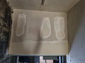Trockenbauer kam und hat fürs Kellerbad noch die Beplankung gemacht, dass zwischen Fliesen und Trockenbau keine Stufe ist. Und im EG-Bad das Missverständnis-Teil ergänzt. Und die beiden Kabelziehlöcher verschlossen.