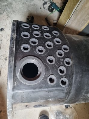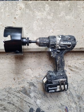 Kabelschacht mit den geliehenen Bohrern gebohrt und Dichtungen eingebaut, schaut aus wie Schweizer Käse.