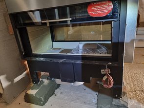 Hinweis: Es ist ein Tunnelkamin mit Glas auf beiden Seiten. Dass man am Foto nicht durchsieht, ist dem Bauzeitenschutz geschuldet: wir haben ein paar Schutzplatten hingeklebt, dass niemand das Glas zerstört.
