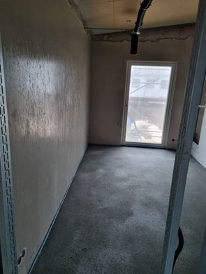 In der Früh nach Rücksprache mit Architekt Heizlüfter aufgestellt, damit wir Feuchte in Griff kriegen.