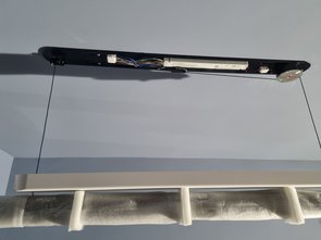 Dann noch beim letzten Tageslicht (kein Problem, ich musste eh lasern, sieht man bei Dämmerung besser) dann noch die Bohrschablone der Mega-Super-Duper-Büroleuchte (wie neu, obwohl es angeblich ein Ausstellungsstück war) ausgerichtet und aufgeklebt.