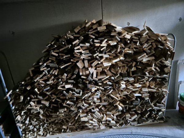 Letzte Woche beim Stihl-Händler gewesen. Neue Kette gekauft und die beiden stumpfen zum Schärfen gebracht. Er meinte, dass ich wohl bissl viele Nägel in den Paletten gesägt habe. Kann leider sein. Also jetzt mehr drauf geachtet (und trotzdem ein paar erwischt. Aber dann sofort gestoppt und neu angesetzt). Vormittag zwei Akkus durchgesägt und am Abend nochmal zwei. Und einen Öltank voll. Hab noch immer ned alles gesägt. Holstellage ist aber schon fast voll... Ich musste bissl improvisieren, da das untere Holz trocken ist und Teile des neuen Holzs echt feucht.