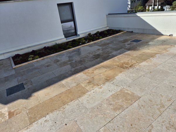 Am Abend dann noch die Pflastersteine und Fliesen abgewischt bzw. abgebürschtl, damit ich die auch imprägnieren kann. Blöderweise weiß ich durch die Schnellaktion nimmer genau, welche Steine schon imprägniert sind und welche noch nicht. Muss ich wohl alle nochmal imprägnieren. Hoffentlich reicht das Mittel. Eigentlich sollte es auch noch für die Attikasteine halten.