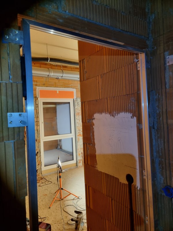 Ich habe dann die Deckzargen der mit Peter montierten Innentüren demontiert und sicher verstaut. Das sind nämlich die sichtbaren Teile dann später. Die jetzt nur noch sichtbaren Aluzargen werden eingeputzt. Damit können die Zargen geschäumt werden und noch die Laibungsbohrungen gesetzt werden. Dann kann der Verputzer kommen.