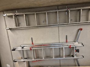 Vor paar Tagen Haken besorgt und heute montiert, dass die dreiteilige Schrägleiter und das Gerüst aufgeräumt sind und nicht am Boden rumstehen und ich die Garage nach und nach aufräumen kann.