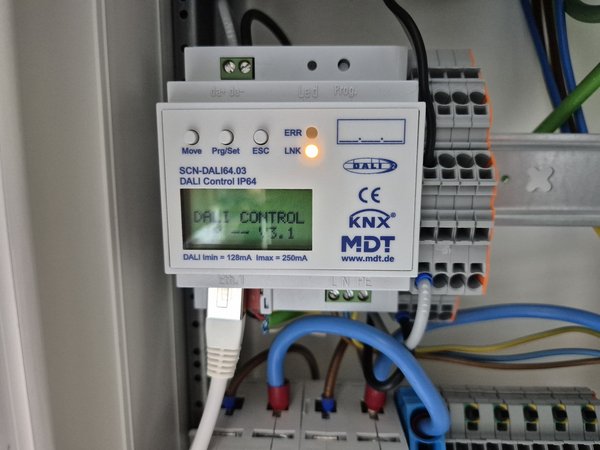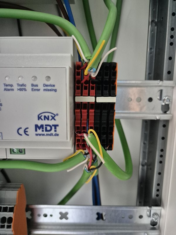 Und auch im Keller verschönert und das Provisiorium abgeklemmt und den Dali-Bus schön auf die Reihenklemmen gelegt. Mal schaun, ob ich die restlichen drei Klemmen überhaupt noch brauch.