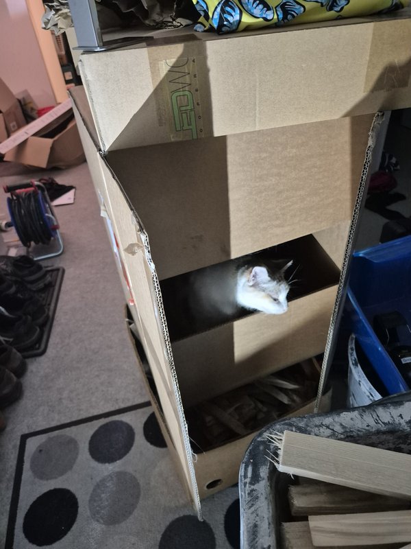 Ich war so konzentriert beim Anschließen, dass ich Tiger nicht wahrgenommen hab. Keine Ahnung, wie sie es geschafft hat, in diesen vorher zugeklappten Karton zu kommen ohne einen riesen Krach zu produzieren.