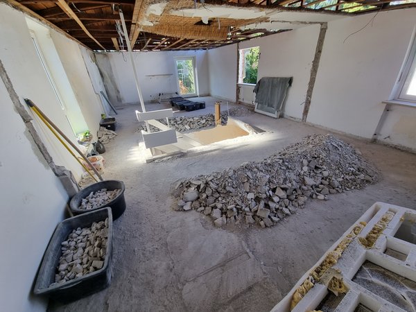 Anna hat fleißig im OG zusammengeräumt und den Schutt sortiert und v.a. den Rest in Wannen gefüllt. Plötzlich schaut es optisch beherrschbar aus. Noch ein paar Mal Wertstoffhof nur noch :-)