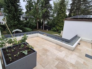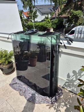 Glaser hatten gestern noch eine lange Baustelle, drum haben sie erst heute Früh aufgeladen und kamen erst bissl später. Dann erstmal die Profile hochgetragen, die (unglaublich schweren) Winkel und die noch schwerereren Glasscheiben.