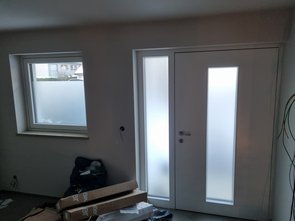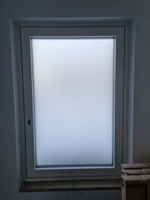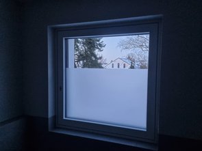 Mama hatte am Nachmittag Zeit, also bin ich mir ihr rüber und wir haben die Milchglasfolien geklebt. Man hat leider extrem ins Haus gesehen. Wenn ich da in Unterhose in die Dusche geh...