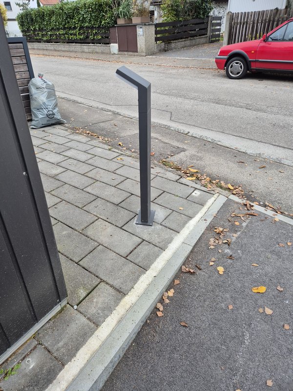 Die Leuchte vom Nachbarn, die ich mit dem Palettenstapel umgenietet hatte, repariert aus der Schlosserei abgeholt und gleich montiert.