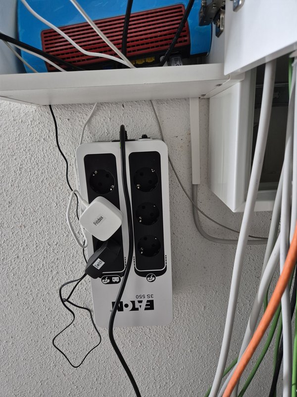 Nächster Anlauf, endlich alle Teile da: USV (unterbrechungsfreie Stromversorgung mit integriertem Überspannungsschutz) montiert. Und Switch montiert und die meisten Stecker schon mal rein. Dachte erst, ich hätte die Stecker falsch montiert, derweil war das Verbindungskabel zur Fritzbox im Eimer :-( Gefühlte halbe Stunde Fehler gesucht :-( Jetzt läufts und ich kann auch ins OG WLAN (maximal schnell per LAN-Kabel) legen.