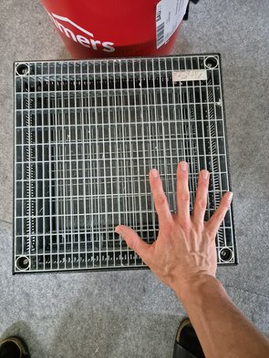 Zur Probe die Revisionsablaufabdeckungen ausgepackt. Noch größer gehts nimmer?! Wären aber auch von den anderen beiden Hersteller so groß gewesen. Kann ich aber nicht montieren, weil ich erst die genaue Position der Travertinplatten brauch. Sonst schauts ja bescheuert aus, wenn die irgendwo zwischendrin positioniert sind.
