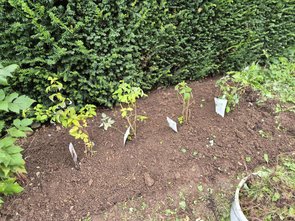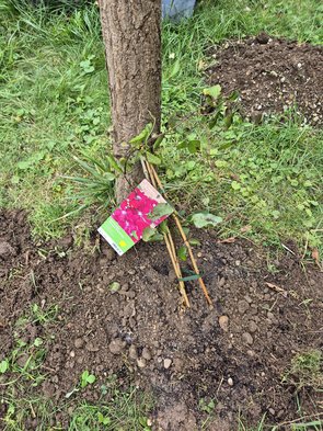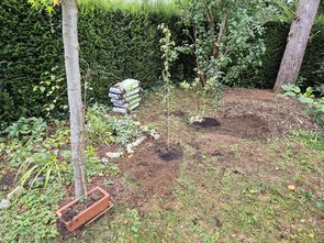 Danach noch den Elstar-Apfelbaum eingepflanzt und die Säulenzwetschge. Und eine Clematis an den Ginko zum Hochranken. Und zwei Clematis an die Ostwand vom Gartenhäusl.
