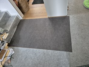Flur bissl zammgeräumt und am Kellerabgang und vor allem am Aufgang ins OG das Supervlies, das ich neulich bei Kleinanzeigen erstanden hatte, gelegt. Kein Schaden unter dem Malervlies und dem Karton drauf am Parkett :-)
