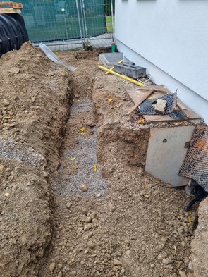 Danach gleich weiter mit dem Regelfallrohr. Da waren sie so schnell, dass ich nicht gesehen habe, dass sie die Zisternenleitung noch nicht drin hatten (ich wusste nicht, dass die so schnell benötigt wurde). Kurz noch zwei Meter wieder raus und nochmal tiefer gegraben.