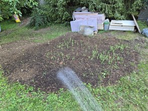 Mama hatte schon vorbereitend Lärchennadeln etc. raus, dann nochmal eine ganze Reihe Schubkarren eingeschaufelt und in den Lichtgraben geschüttet. Langsam wirds viel. Aber sollt sich genau ausgehen, dass es nicht zu viel wird. Morgen noch eine Runde, dann ist das Thema durch. Und die Lärche kann wieder voll Wasser aus dem ganzen Wurzelbereich schöpfen und der Lichtgraben ist bereit für die Absturzsicherung.