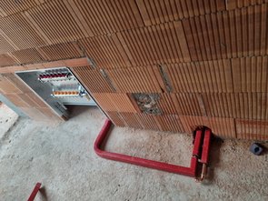 Am Abend kam dann noch Fensterbauer und hat mit Laser die Fassade und die Fensterlaibungen kontrolliert. "Nullpunkt" gefunden, festgelegt und markiert. Fenster kommen richtig schön weit nach vorne :-)