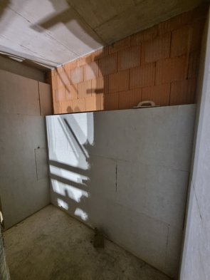 Radlkellerwand zur Rampe ist 1 m gedämmt (reicht so), die Wand zum Vorratsraum hätte eigentlich gar nicht gedämmt werden müssen, habe ich aber trotzdem. Zum einen, dass wir einen Puffer haben, falls später irgendeine Dämmmaßnahme zu wenig war, dass wir keinesfalls unter die KfW-Werte rutschen. Und zum anderen wollen wir keine ungedämmte Wand, auch wenn es ein dickerer Ziegel ist (das Geld hätten wir uns sparen können, aber egal).