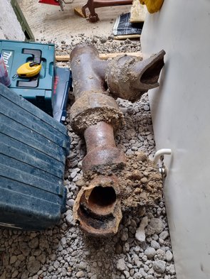 In der Wartezeit mit Peter noch das alte WC-Rohr rausgestemmt, damit da gscheit zugemauert werden kann.