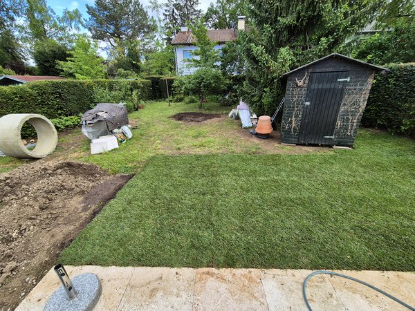 Das Legen des Rollrasens ging erfreulich einfach und schneller. Es hat fast länger gebraucht, die Rollen aus der Einfahrt in den Schubkarren zu laden und hinter zu fahren als zu legen und die Reste zu schneiden.