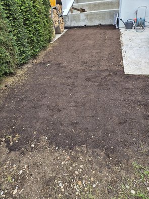 Erde von Dehner aufgebracht und nochmal bissl nachgeglättet (deutlich aufwendiger als gedacht, Erde ganz glatt zu bringen). Dann Dünger und Bodenaktivator aufgebracht, während Mama den Monsterflieder hinten und das "Unkraut" rund um die Gartenhütte gebändigt hat.