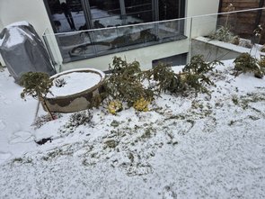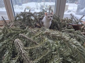 Der geschenkte Christbaum hatte leider nicht bis Lichtmess gehalten. Also wars jetzt definitiv an der Zeit, ihn zu zerlegen. Bissl die Rosentriebe geschützt.