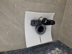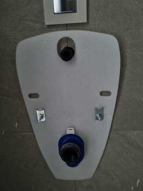 Urinal fertig montiert (leider nicht fotografiert), WC auch montiert inkl. Deckel made in Austria. Nein, das ist kein Ufo, so befestigt man ein WC ohne seitliche Bohrungen, ganz chic...
