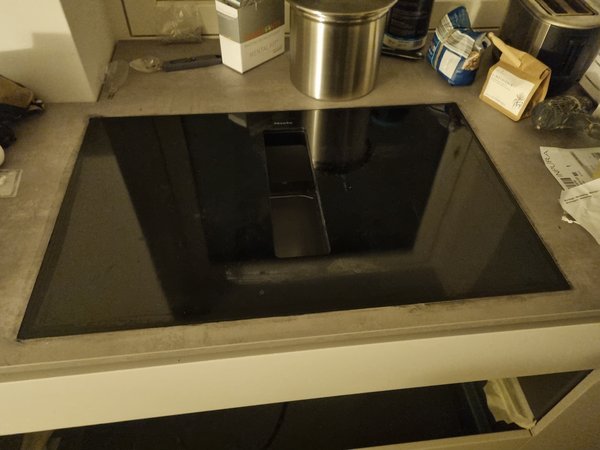 Dann begann leider schon der Wettkampf gegen die Dämmerung. Induktionsplatte den Rahmen nochmal schön ausgesaugt, mit Silikon abgespachtelt, Auflageband eingeklebt und dann eingesetzt und mit Ofensilikon ausgespritzt und geglättet. Die schwarzen Streifen am Rand kann ich morgen dann abrubbeln. Hab exakt wie von Miele vorgeschrieben 5,5 mm gefräst, gefühlt hätten aber 5 mm gereicht.
