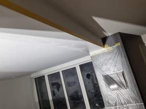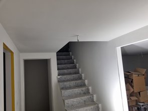 OG-Flur abgeklebt, dass ich den nochmal maler. Dabei entdeckt, dass auch die Decke nicht wirklich perfekt ist. Bevor ich jetzt Decke und Wände separiere, mach ich alles nochmal durch. Fensterbankl mit Acryl verfugt, dass ich das morgen malern kann.