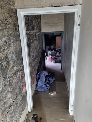 Dann die innere Schleusentür reingetragen - mit 2,13 m etwas unhandlicher. Leider waren die Fliesensockel im Weg. Ich dachte, ich hätte dem Fliesenleger gesat, dass da keine Sockel hinkommen, aber egal. Schnell weggestemmt, Metabohammer lag ja eh da. Nächstes Hindernis: das für Einmann-Montage nicht gut geeignete Monstrum reinquetschen: Höhe stimmt nicht. Estrich und/oder Fliesen ein bisschen zu hoch auf einer Seite :-( Also: erstmal stemmen. Wieder probieren und das Monstrum reingefummelt. Musste 2 x nachstemmen, dann endlich war sie drin. Höhenregulieren war dann bissl kompliziert. Dank der Übung von der ersten Tür und der wirklich durchdachten Montagehilfe der seitlichen Schrauben gings dann doch ganz gut. Gefühlt doppelt so lang wie für die erste Tür gebraucht. Aber Ende gut, alles gut. Schnell noch saugen und bissl zammräumen und in der Gewitterpause heim.
