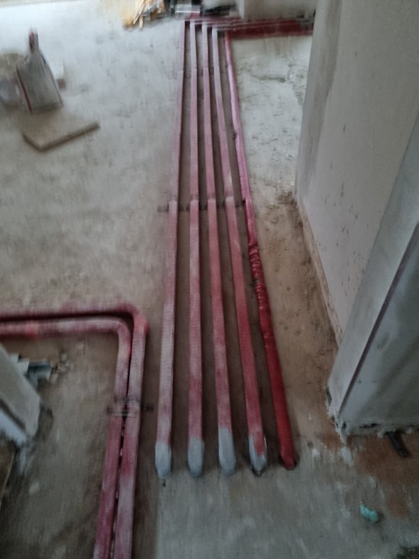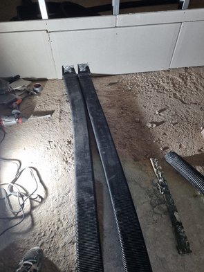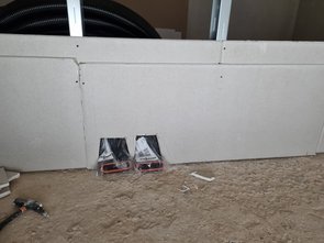 Mit Blechschere aus Papas Beständen bewaffnet gings dann ins OG. Blech des Trockenbaus ausgeschnitten, damit die Lüftungsrohrwinkel montiert werden konnten. Ging erstaunlich gut. Bei den Lüftungsrohren für EG-Bad und Esszimmer wars komplizierter, ging aber auch ganz gut. Musste ganz vorsichtig rundrum wegstemmen. Hat Baufirma leider bissl viel Beton unten drunter. Ich dachte, ich hätte die Rohre runter gepresst, aber offenbar ned genug (oder der Winkel war zu flach). Auf jeden Fall sind die Rohre jetzt mit den Adaptern auf Flachkanal verlängert, der Flachkanal in die Trockenbauwand verzogen und dort wieder auf Rundrohr umgestellt. So kann Heizungsbauer am Montag verlängern.