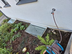 Da ich die Alusäge eh aufgebaut hatte, auch gleich die Noppenbahnabdeckprofile geschnitten. Das ist ein Aluprofil mit einer Kunststoffabdeckung. Aber erstmal vorne den mit Erde vollgespritzten Sockelputz abgewischt. Nach dem Zuschnitt mit den richtigen Winkeln (der Winkelmesser von Obi ist echt geil) musste ein Primer auf die Klebestelle. Stinkt fast so wie Ullis Flüssigkunststoff. Danach 15 Minuten lüften lassen (steht echt so in der Anleitung). Dann kommen zwei Klebestränge drauf und ich habe zur Sicherheit noch Schrauben in die Löcher in die Sockeldämmung rein. Jetzt muss es trocknen. Danach muss ich dann die Noppenbahnen ranfummeln und die Abdeckungen aufklippen und idealerweise oben noch verfugen.