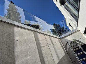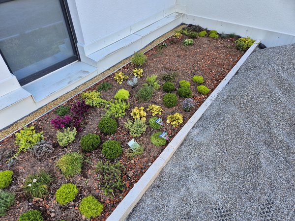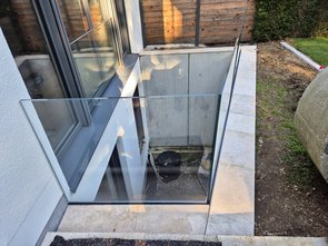 Dann waren die Fliesen auf der Lichtgrabenmauer und auf den Trögen dran. Bei der Vorbereitung kurzer Schock: es fehlte eine Fliese! Zum Glück hatte ich nur eine verkehrt herum beim Imprägnieren gedreht. Ein schöner Batz, fast so klebrig wie die Trogbeschichtung (gleicher Hersteller). Leider war der Untergrund ganz schön bucklig. Vielleicht hätt ich Gehrungsschnitte an den Wasserablaufkanten machen sollen. Aber das wäre mit der Profilhöhe der Absturzsicherung eine echte Wissenschaft geworden. Außer mir sieht die zwei Übergänge wahrscheinlich eh nie jemand.