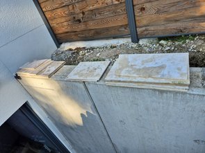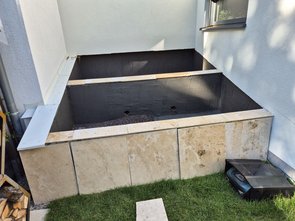 Mit Mama probegelegt und die schrägen Zuschnitte gemacht. Mega gut geklappt. Sogar die Vertikalplatten hab ich noch geschafft. Vor lauter Euphorie und dem Drang, den dritten großen Tagespunkt noch zu schaffen, hab ich das Foto der Fliesen auf der Lichtgrabenwand vergessen.