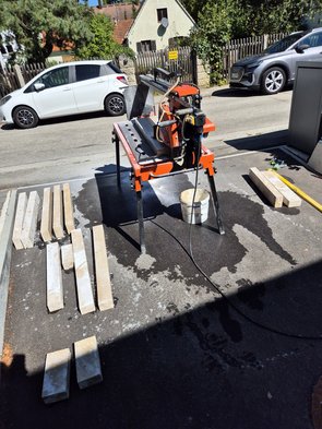 Nachbarn waren zum Glück alle unterwegs. Los gings mit den Randsteinen, die ich letzte Woche aus dem Allgäu geholt hatte. Jeweils 12,5-cm-Stück aus den 35-cm-Stücken geschnitten. Das mittlere Stück von knapp 10 cm (der Rest ist Verlust durch die Dicke des Sägeblatts) aufgehoben für Pflastersteine. Man muss seeehr langsam schneiden, damit die Diamanten nicht verbrennen. Aber ansonsten ging es echt gut. Ein Stein musste auch noch gekürzt werden und dann noch ein paar Pflastersteine geschnitten. Die kommen dann vor die Tröge. Schlag 12 fertig geworden :-)