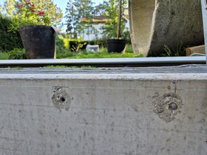 Prompt ist ein Loch ausgebrochen (das war, wovor ich Angst hatte). Es ist aber nur ganz außen und oben abgebrochen und statisch irrelevant. Es ist alles so bombenhart. Jetzt verstehe ich, warum mein Bauingenieur da so entspannt war, dass ich nicht so viel "Fleisch" oberhalb brauch. Zu zweit ging das Anzeichnen schneller, weil ich ja immer mit dem Lager die Höhe und dann exakt 25 cm Bohrlochabstand anzeichnen musste und dazu die Leiter ständig verstellen. Mit der Grünlichbrille sieht man den Laser echt gut :-) Blöd nur, wenn man dann den Meterstab auch lesen will ;-) Gefühl ist diese Anzeichenmethode deutlich präziser als die vorherige Variante mit Hinhalten des Profils und Markieren aller einzelnen Löcher im Aluprofil.