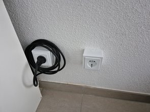 Hat sich als nicht praktikabel erwiesen, im Waschraum und Heizkeller keine "normalen" Steckdosen zu haben, also durch die vor paar Tagen vorbereitete Bohrung Kabel gelegt und eine Steckdose ins Waschhaus gebaut und eine Doppeldose in den Heizkeller.