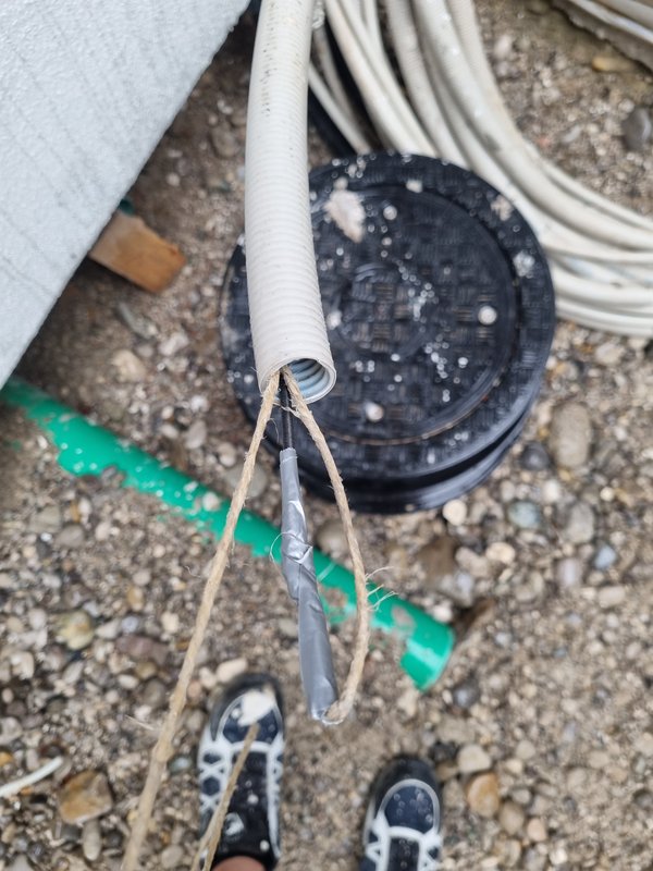 Mitteldickes Paketband mitgenommen und nochmal "eingesaugt" - ein Gepfeife :-( Mit dem mitteldicken Faden den dicken durchgezogen. Hatte mehr als einmal das Gefühl, dass es jetzt gleich reißt. Ging aber gut. Dann kam die Herausforderung: das Durchzugskabel reinbringen. Ich dachte, dass es mit dem Glasfaserkabel gut gehen müsste. Leider nicht. Also die Metallsprirale rein. Lange gebraucht, weil ich immer von einem Ende zum anderen Ende rennen musste, Und es immer mal wieder so streng ging, dass ich befürchtet hatte, dass es reißt. ABER: es ist durch :-)
